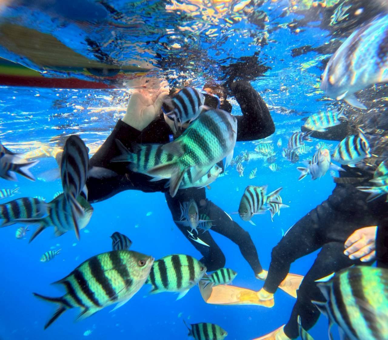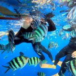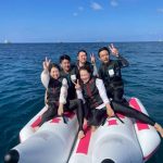 半年前から計画を練り、積立金も集め、待ちに待った当日。気合いの入っているメンバーは、無駄に朝早くから集合し、神戸空港でワクワクが抑えきれず、朝からテンション高めで、いざ飛行機へ搭乗。寝ようとしているのに、寝ときよ~と声をかけられる社員。那覇空港からレンタカーを借り、常連になりつつある「ヒルトン沖縄北谷リゾート」へ。到着後、昨年も行ったアメリカンヴィレッジのステーキ屋さんでまずは腹ごしらえ。その後は、シュノーケル組、美ら海水族館組の2チームに分かれ、思い思いに沖縄旅行をスタートさせました。シュノーケルでは、言葉にできないほど幻想的なブルーの海に潜り、魚たちと戯れました。